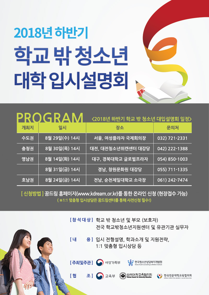 대학 진학을 준비하고 있는 학교 밖 청소년들을 위해 2018년 하반기 학교 밖 청소년 대학입시설명회를 개최합니다.