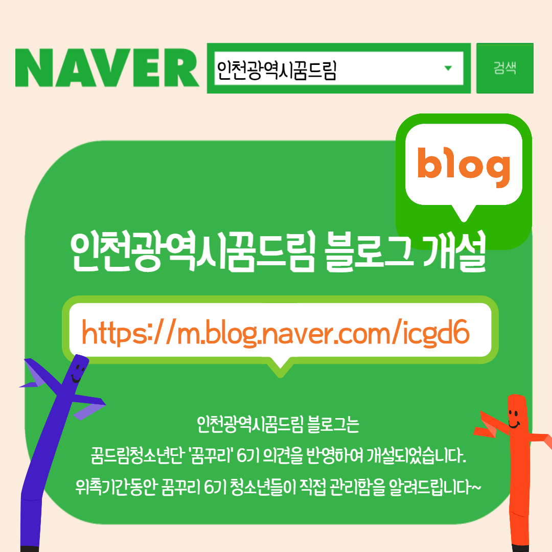 인천광역시꿈드림 블로그는 인천권역 꿈드림 청소년단 '꿈꾸리' 6기 의견을 반영하여 개설되었습니다.
