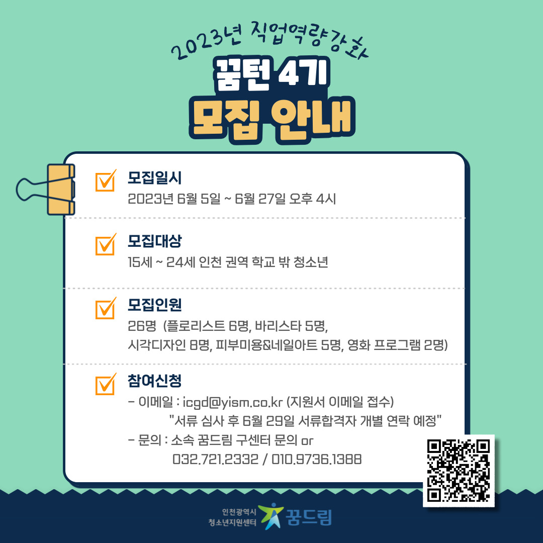 • 신청방법 : 첨부파일 '2023년 직업역량강화 '꿈턴' 4기 모집 안내 및 신청서'를 다운받아 작성하여